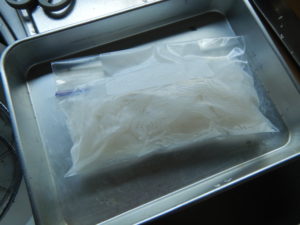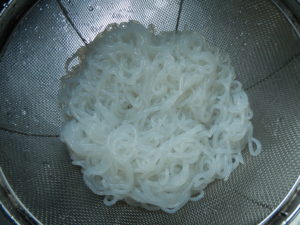 2.袋のまま水にあてて解凍し、ザルにあけます。下の写真は凍らせた後の白滝の写真です。水分が抜けて見た目が少し春雨のようになっています。触った感じも硬くなっているのが特徴です。